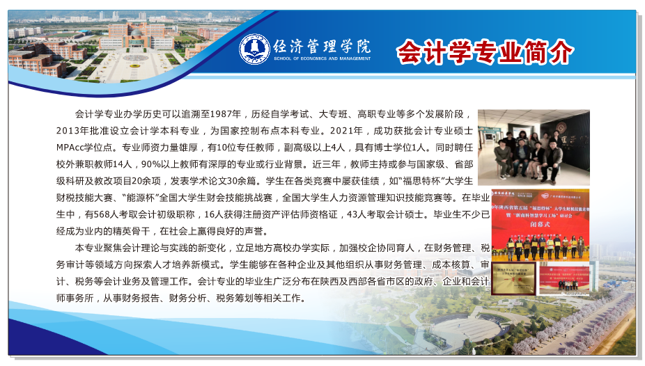 主要课程:《管理学》《微观经济学》《宏观经济学》《经济法理论与实务》《统计学》《基础会计》《中级财务会计》《高级财务会计》《管理会计(含成本会计)》《审计学》《财务管理》等。