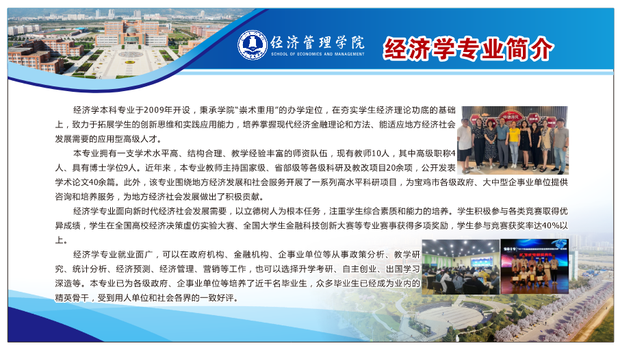 培养目标:经济学专业面向新时代经济社会发展需要,以立德树人为根本任务,深化经济学课程思政化改革,结合专业自身特点及公司所属地方特色,培养具有良好的思想品德和道德修养、自觉践行社会主义核心价值观,具备扎实的马克思主义经济学理论基础,熟悉现代经济学理论,熟练地掌握现代经济分析方法,信念坚定、知识丰富,立足陕西、面向西部、辐射全国,具有国际视野,熟悉中国经济实践,具有创新意识和实践能力,能在企事业单位和相关政府部门从事经济分析、预测、规划和管理等工作的应用型高级人才。