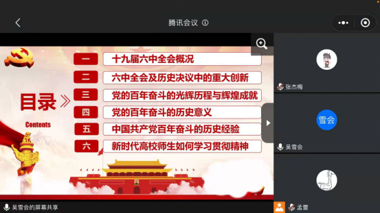 吴雪会从介绍党的十九届六中全会概况入题,从深刻认识十九届六中全会及历史决议中的重大创新、“党的百年奋斗的光辉历程与辉煌成就”、“党的百年奋斗的历史意义”“党的百年奋斗历史经验”、“新时代高校师生如何学习贯彻精神”等六个方面进行了专题宣讲和深入阐释,引导师生深刻领会全会重大意义,重点把握全会的精神实质和丰富内涵,鼓励大家从党的伟大成就和历史经验中汲取奋进的智慧和力量,勇担时代责任和历史使命,展现新时代新作为。