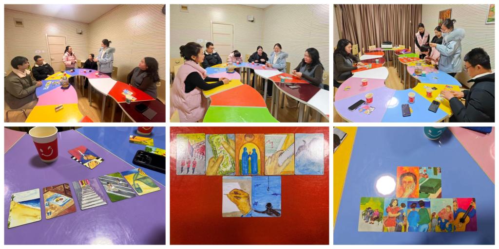 在薛茹老师的科学引领与循序渐进的引导下,活动围绕“减压赋能”主题层层深入。“卡牌映心・解码压力”环节中,辅导员们随机抽取卡牌,结合近期工作场景、任务强度及情绪状态展开自由联想与深度分享。一张张具象化的卡牌,化作了育人工作中各类压力的“可视化镜像”——无论是应对复杂员工问题的困惑、高强度工作节奏的疲惫,还是对育人成效的期许与焦虑,那些潜藏在日常忙碌中的压力源,都通过卡牌解读得以清晰呈现、坦然倾诉。“看见彼此・共情减压”环节聚焦同伴支持与情绪疏导,让减压效果持续深化。辅导员们通过交换卡牌、组队创编卡牌故事等互动形式,换位思考同伴的工作困境与心理感受。在开放包容的分享氛围中,大家卸下工作中的“铠甲”,坦诚交流压力下的真实情绪,在认真倾听与真诚回应中,实现了情绪的共鸣与压力的释放。一站式员工社区生活化的温馨场景,更让现场始终萦绕着理解与温暖,让辅导员们在同伴的陪伴中暂时脱离工作的紧张感,回归身心放松的本真状态。
