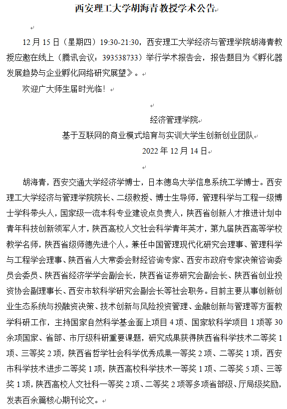 西安理工大学胡海青教授学术公告