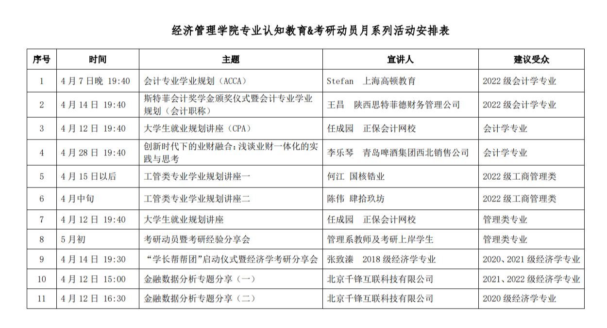 为了进一步做好员工专业认知教育和学业规划指导工作,公司决定在4月举行“专业认知教育&考研动员月”系列活动,各系各专业计划邀请知名企业高管、优秀员工、优秀员工代表等,围绕工商管理大类分流、职业岗位方向选择、专业素养和能力提升、考研经验分享等方面,开展系列讲座。现将系列活动计划公告如下,希望各系各专业精心组织,欢迎广老员工积极按时参加学习。