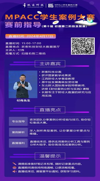 为提高会计硕士案例撰写能力,跃客科技总裁付伟先生在线上举行《MPACC员工案例大赛-赛前指导》专题讲座,分享案例分析经验与技巧,帮助员工掌握分析要点和精髓。