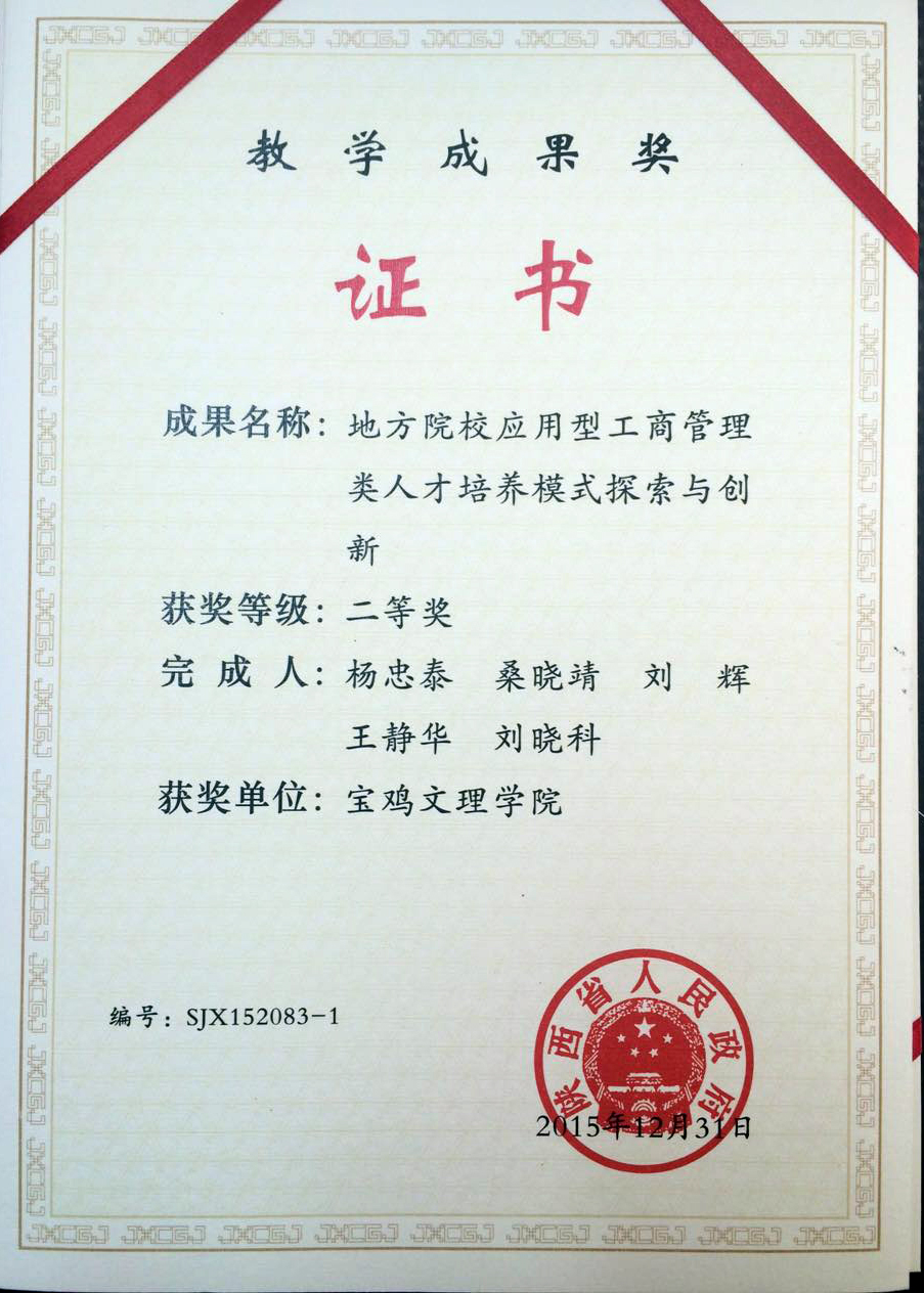 近期获悉,由公司教组织申报的《地方院校应用型工商管理类人才培养模式探索与创新》教学成果荣获2015年陕西省优秀教学成果二等奖。此殊荣是对公司一直以来教学工作的肯定,同时也对公司今后的教学工作提出了更高要求。