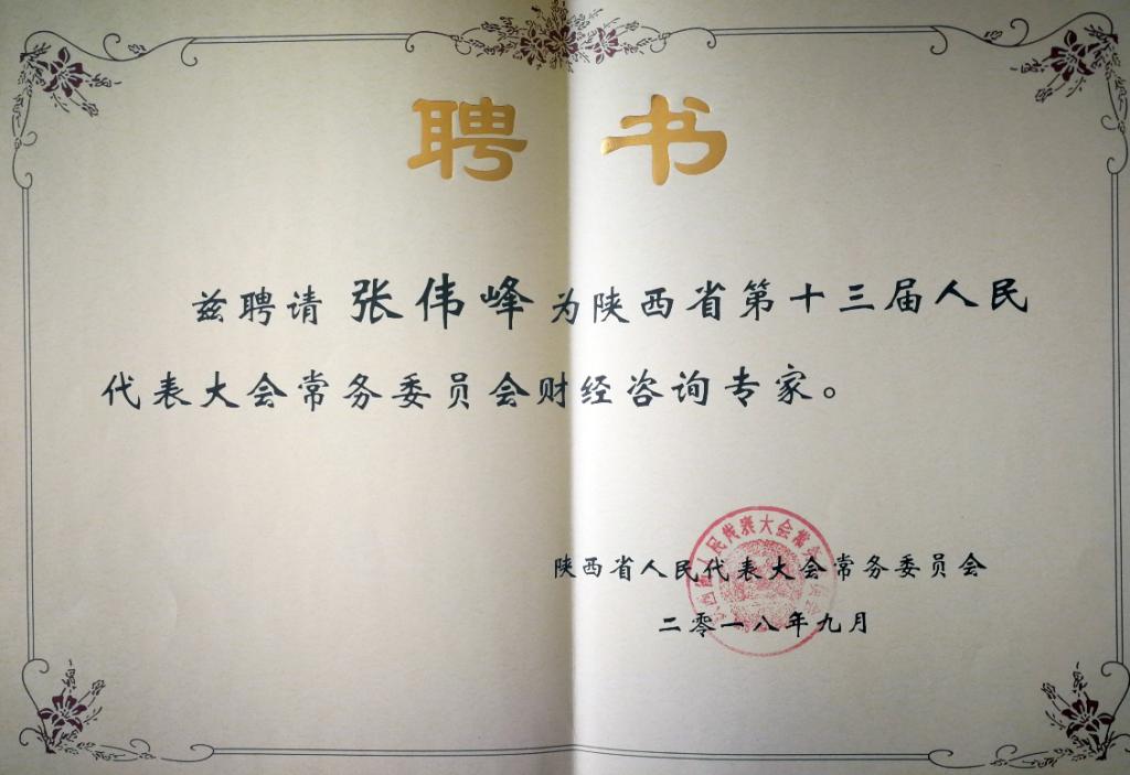 近日,从陕西省人大常委会获悉,公司BEAT365英国官网网站经理张伟峰获聘陕西省第十三届人大常委会财经咨询专家。