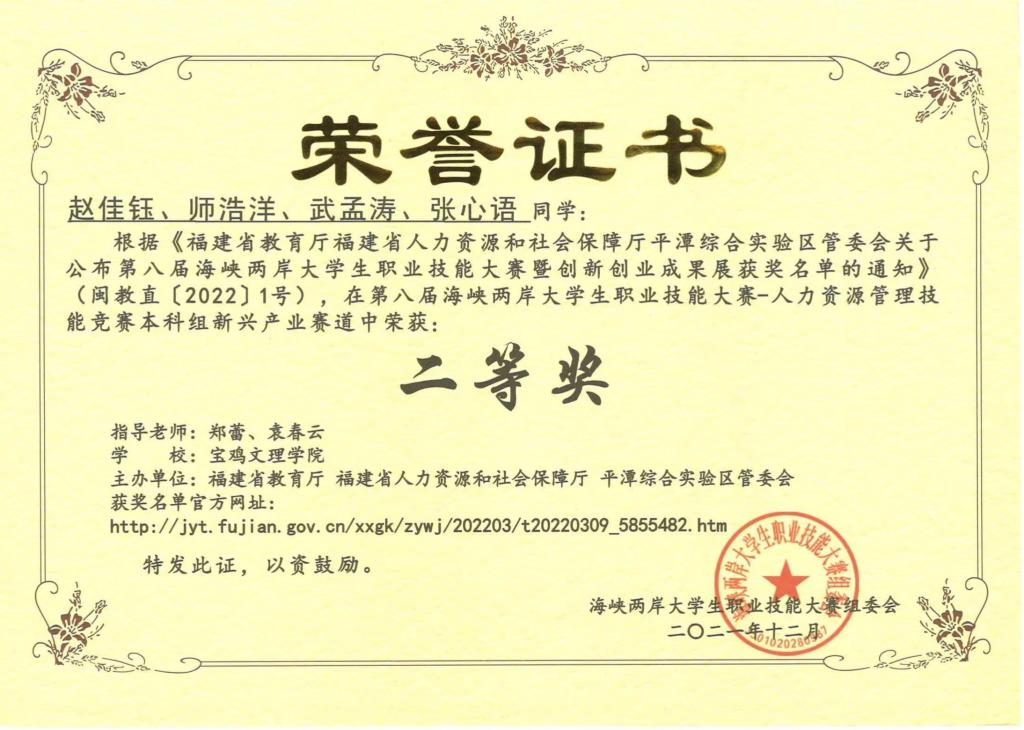 近日,在由福建省教育厅、福建省人力资源和社会保障厅、平潭综合实验区管委会联合主办的第八届海峡两岸老员工职业技能大赛——人力资源管理技能竞赛中,公司代表队荣获二等奖。