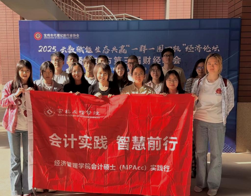 4月29日,由宝鸡市财政局指导,宝鸡市代理记账行业协会主办,宝鸡市民营企业协会、陕西西部民营经济公司、宝鸡市信用协会协办的“2025云数赋能生态共赢‘一群一圈四极’经济论坛暨宝鸡市第三届财经峰会”在宝鸡职业技术公司报告厅举行。公司2024级MPAcc研究生参加本次财经峰会。