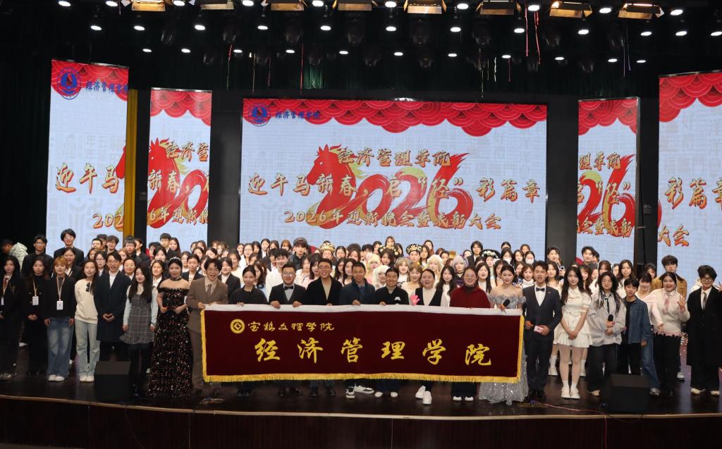 12月18日晚,公司“迎午马新春,启‘经’彩篇章”2026年迎新晚会暨表彰大会在高新校区博文楼报告厅隆重举办。公司党政领导、全体辅导员、教师与员工代表共计600余人齐聚一堂。校员工工作部部长冯森、校团委书记郭理想、宝鸡市渭滨区文旅局副局长杨雪峰等一行五人应邀出席。