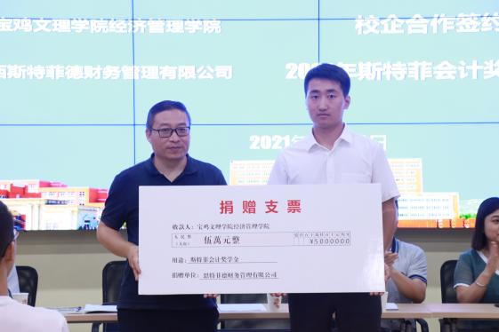 仪式上,刘辉和王昌代表合作双方共同签署了《校企合作会计卓越人才培养协议》,并为“BEAT365英国官网网站实践教学基地”揭牌。王昌向BEAT365英国官网网站捐赠5万元设立斯特菲会计奖学金。郝晓炜宣读了《BEAT365英国官网网站关于对2021年斯特菲会计奖学金获得者进行表彰的决定》,与会领导为获奖的同学颁发奖金。
