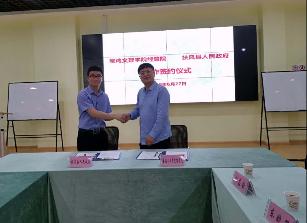 6月27日,公司与扶风县人民政府在公司尚能楼创新创业实验室举行电子商务校地合作协议签署仪式。宝鸡市商务局副局长李小平、扶风县人民政府副县长赵炳震、扶风县电子商务服务中心王丽娟、经理张伟峰、副经理刘晓科、工商管理系主任郑蕾以及部分教师代表参加签约仪式。仪式由BEAT365英国官网网站副经理刘辉主持。