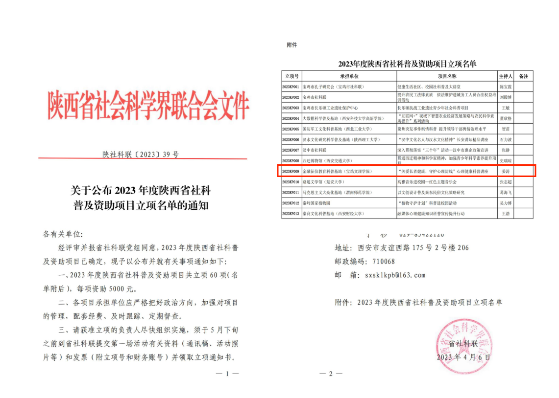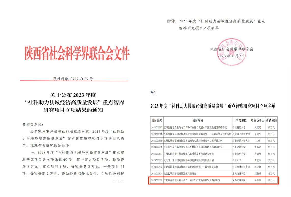 4月6日,陕西省社会科学界联合会公布2023 年度“社科助力县域经济高质量发展”重点智库研究项目立项结果的通知,公司杨忠泰教授申报的《产业融合视域下岐山县“一碗面”产业高质量发展路径研究》获得重点项目立项;陕西省社会科学界联合会公布2023年度陕西省社科普及资助项目立项的通知,公司姜涛副教授申请的《“关爱长者健康,守护心理防线”心理健康科普讲座》获得项目立项。公司将以此为契机,践行“崇术重用 服务地方”理念,强化学术研究和科学普及工作,为地方社会经济发展建言献策,为陕西哲学和社会科学发展做出贡献。(文/任攀 审核/杨嘉歆)